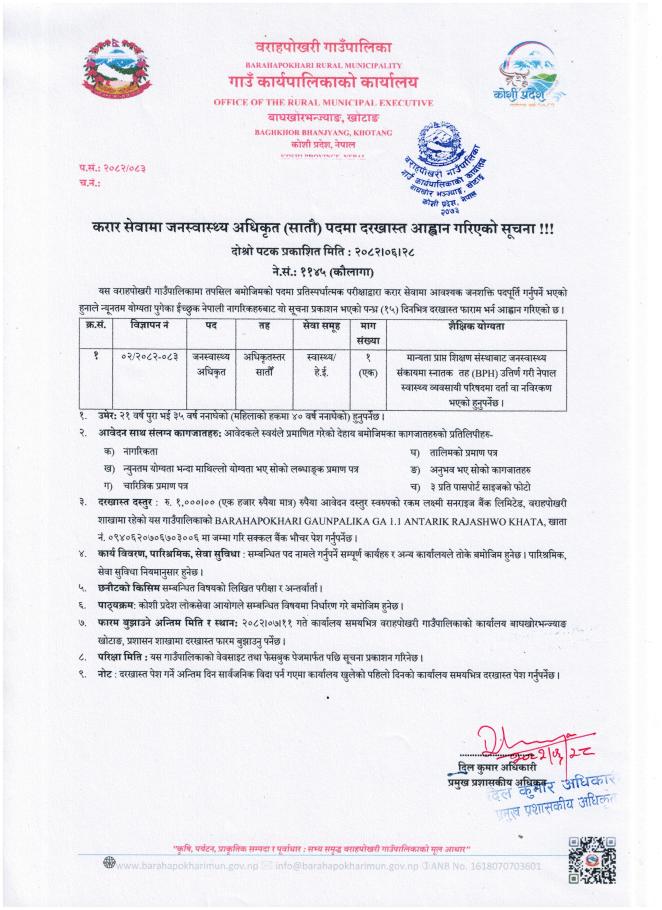 करार सेवामा जनस्वास्थ्य अधिकृत (सातौ) पदमा दरखास्त आह्वान गरिएको सूचना !!! (दोश्रो पटक प्रकाशित)