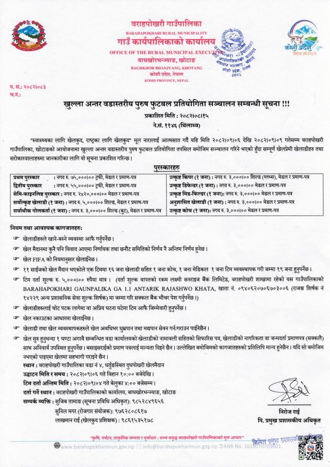 खुल्ला अन्तर वडास्तरीय पुरुष फुटबल प्रतियोगिता सञ्चालन सम्बन्धी सूचना !!!