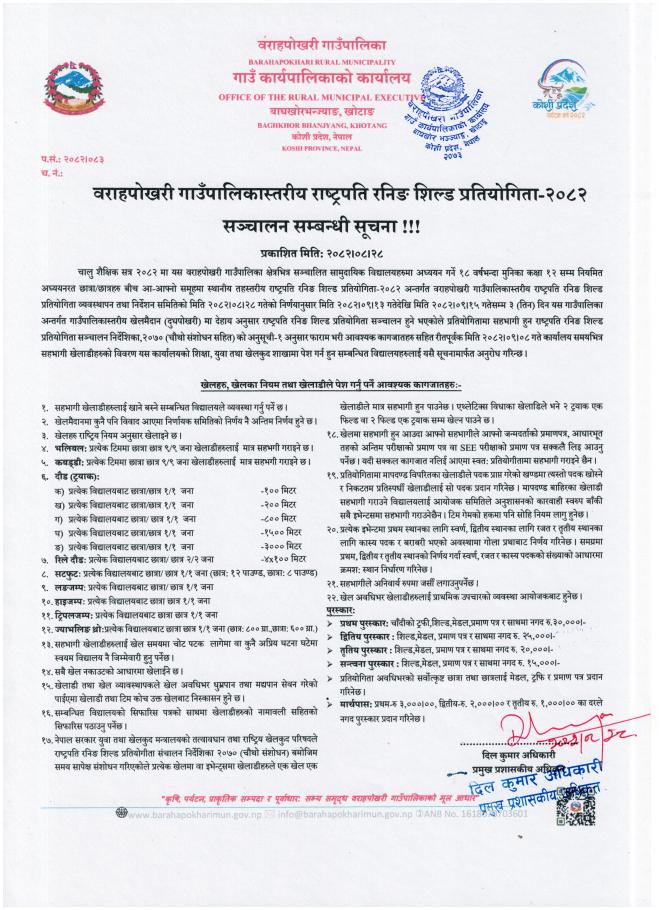 » वराहपोखरी गाउँपालिकास्तरीय राष्ट्रपति रनिङ शिल्ड प्रतियोगिता, २०८२ सञ्चालन सम्बन्धी सूचना ।