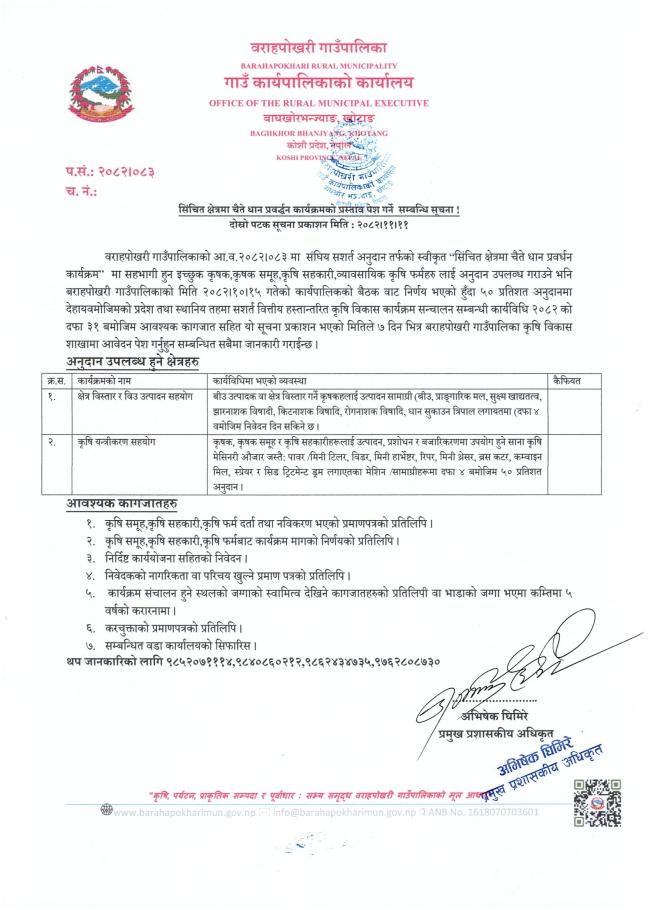 » सिंचित क्षेत्रमा चैते धान प्रबर्धन कार्यक्रमको प्रस्ताव पेश गर्ने सम्बन्धी सूचना !!!