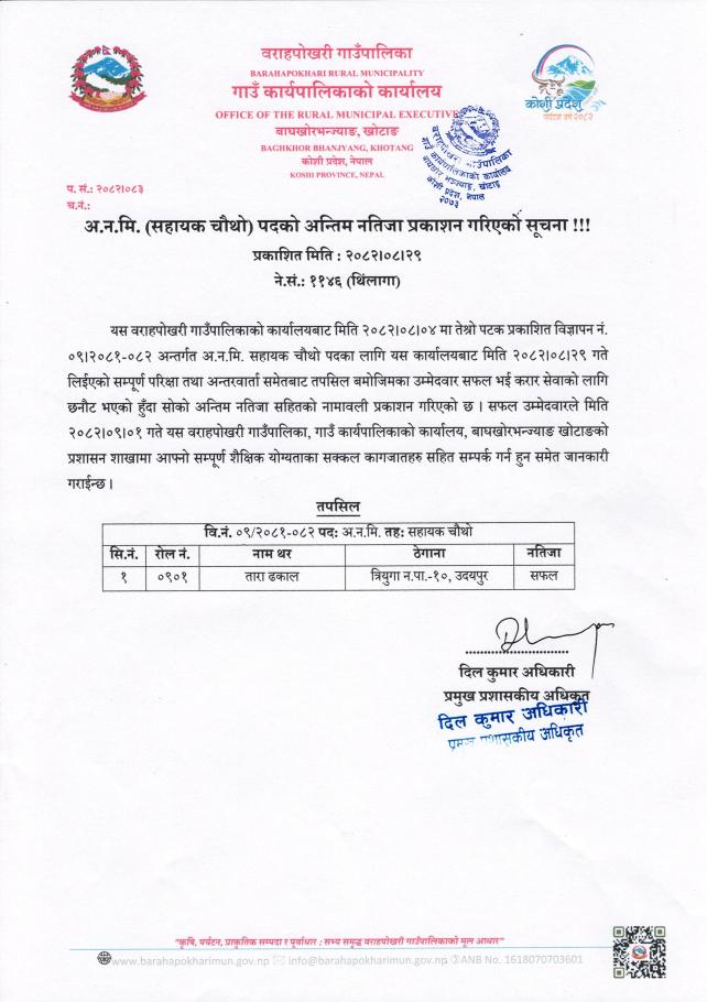 अ.न.मी. (सहायक चौथो) पदको अन्तिम नतिजा प्रकाशन गरिएको सूचना !!!