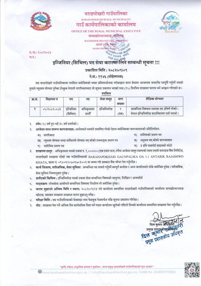 इन्जिनिर (सिभिल) पद सेवा करारमा लिने सम्बन्धी सूचना !!!