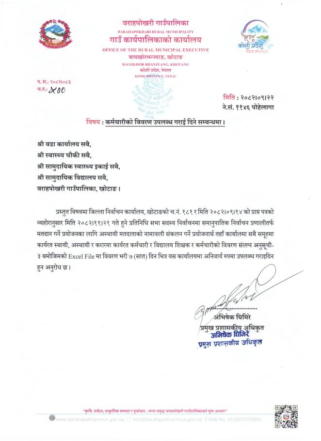 Home » कर्मचारीको विवरण उपलब्ध गराई दिने सम्बन्धमा । (श्री वडा कार्यालय सबै, श्री स्वास्थ्य चौकी सबै, श्री सामुदायिक स्वास्थ्य इकाई सबै, श्री सामुदायिक विद्यालय सबै, वराहपोखरी गाउँपालिका, खोटाङ)