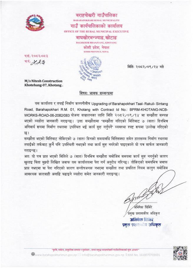 जवाफ सम्बन्धमा । (श्री नितेश कन्स्ट्रक्सन, खोटाङ)