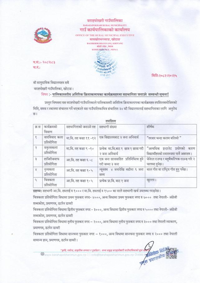 पालिकास्तरीय अतिरिक्त क्रियाकलापका कार्यक्रमहरुमा सहभागिता जनाउने सम्बन्धी सूचना !!!