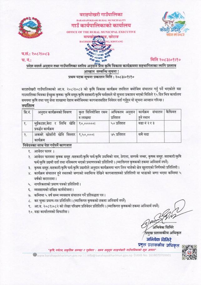 » प्रदेश सशर्त तथा गाउँपालिका स्तरिय अनुदान प्राप्त कृषि विकास कार्यक्रममा सहभागिताका लागि प्रस्ताव आव्हान सम्बन्धी सूचना !!!