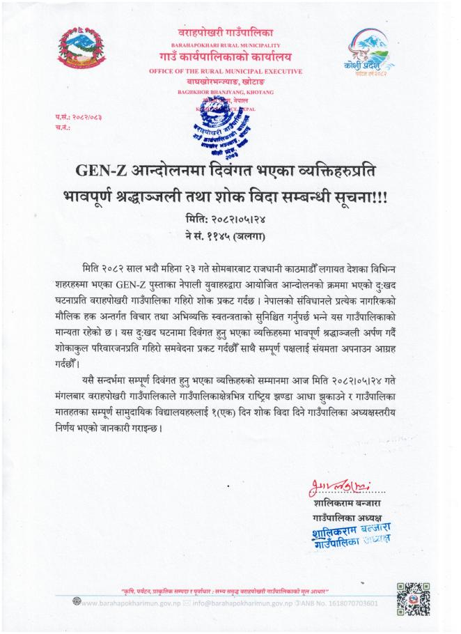 » GEN-Z आन्दोलनमा दिवंगत भएका व्यक्तिहरुप्रति भावपूर्ण श्रद्धाञ्जली तथा शोक विदा सम्बन्धी सूचना!!!