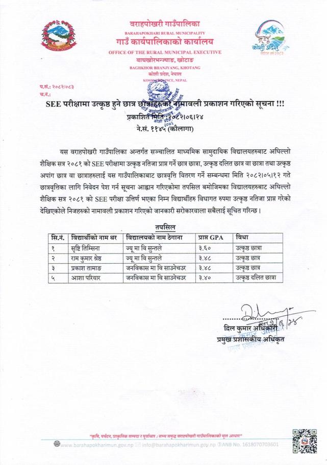 SEE परीक्षामा उत्कृष्ठ हुने छात्र छात्राहरुको नामावली प्रकाशन गरिएको सूचना !!!